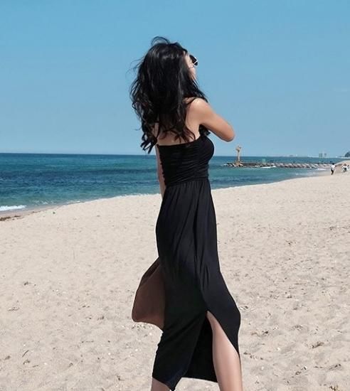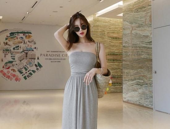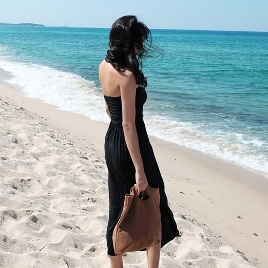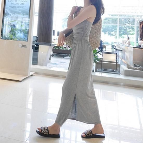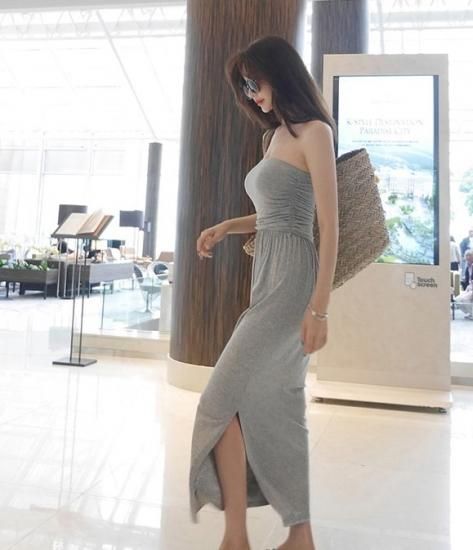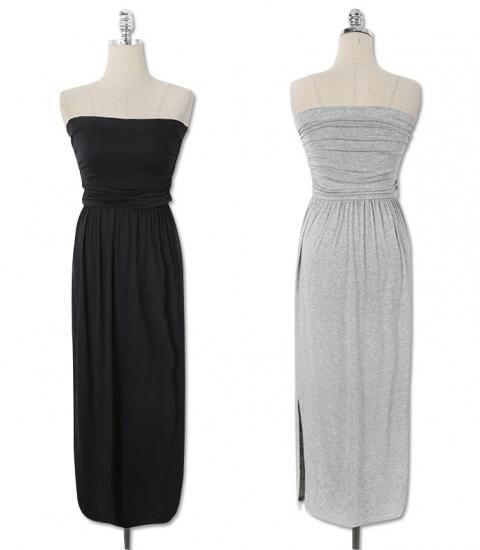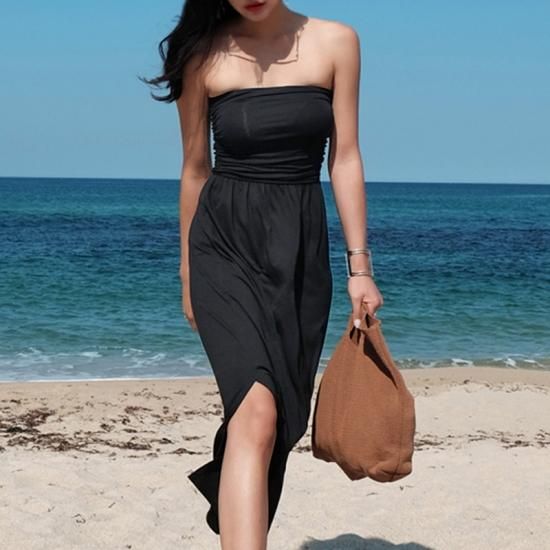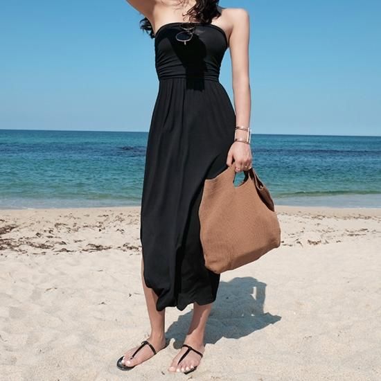 サイドスリットがフェミニンなベアトップのロングワンピ