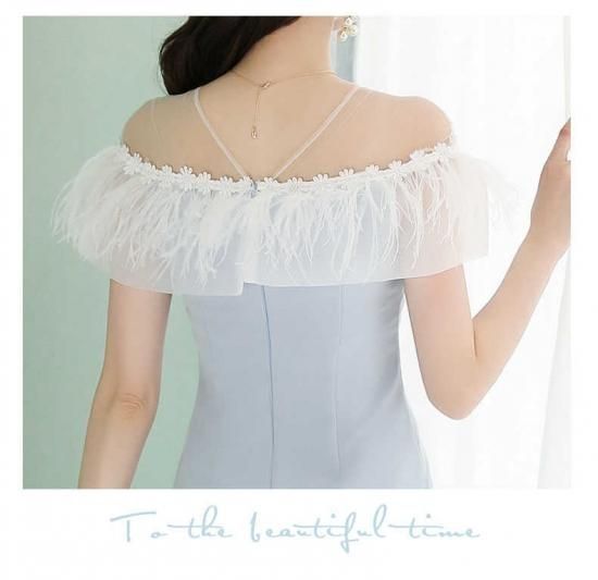 オフショルの花柄刺繍&エアリーな装飾が目を惹くタイトドレス