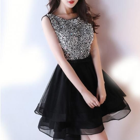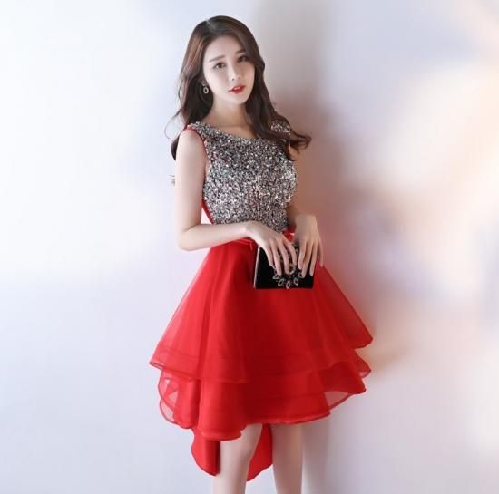 スパンコールとビジューでゴージャスなドレスに異素材MIXのチュールで華やかなデザイン。
