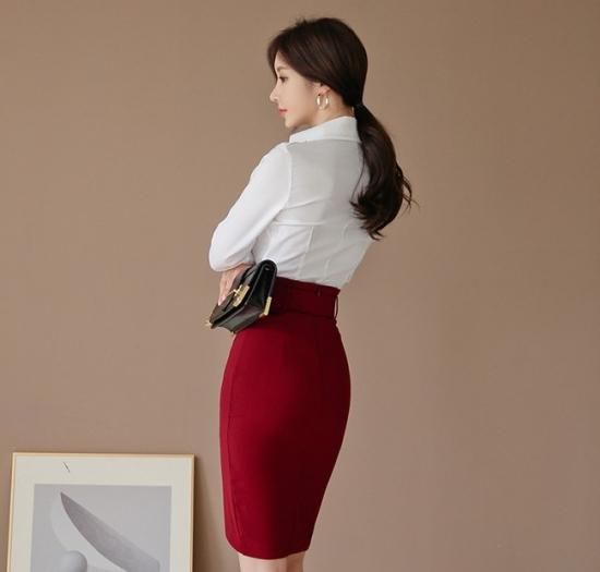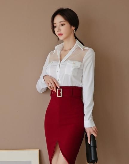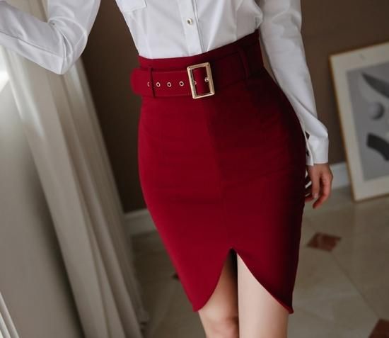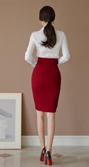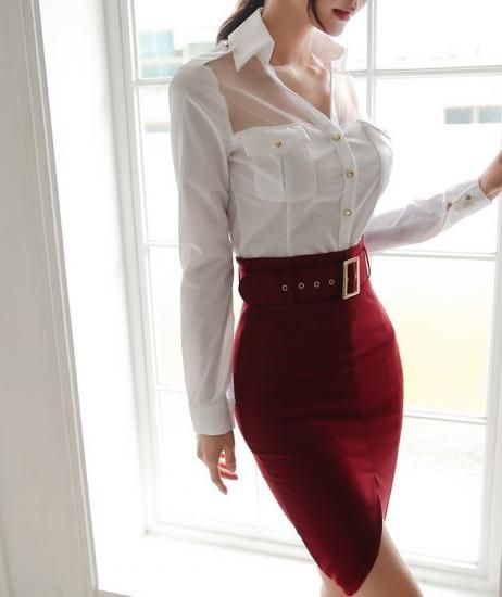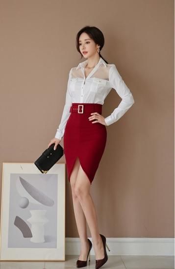 タイトなベルト付きスカートは大胆カットの脚見せで視線集中間違いなし。