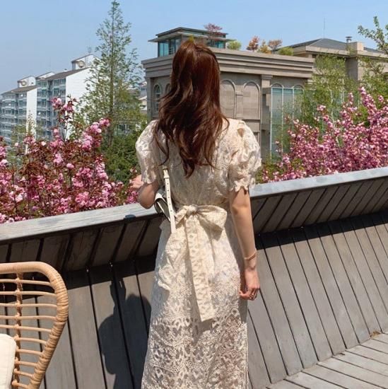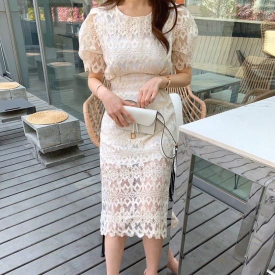 清楚かわいい総レース バックリボンのパフスリーブタイトワンピース