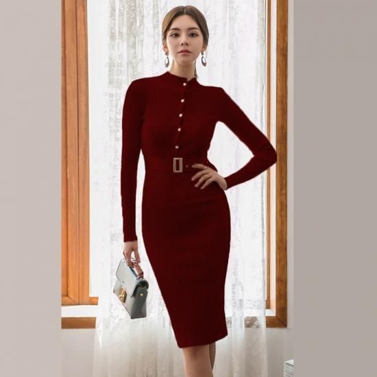 タイトな美シルエットでフェミニンに スタンドカラーのベルト付き膝丈リブニットワンピース 4色