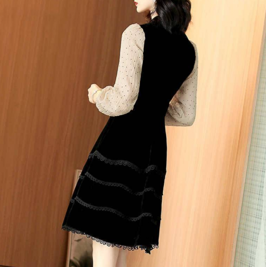 デイリーからお呼ばれまで活躍 プチドット柄シフォンの膝丈長袖フレアワンピース S〜3L 大きいサイズ