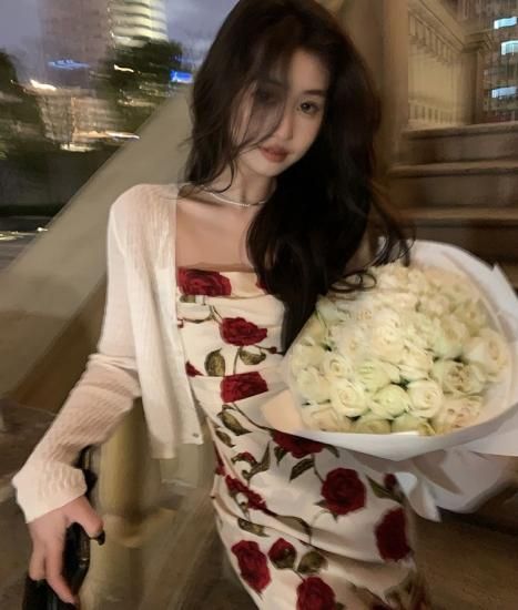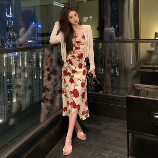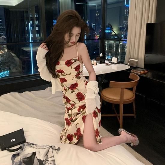 ゴージャスなローズプリント ロング丈キャミソールのボディコンセクシーワンピース ドレス