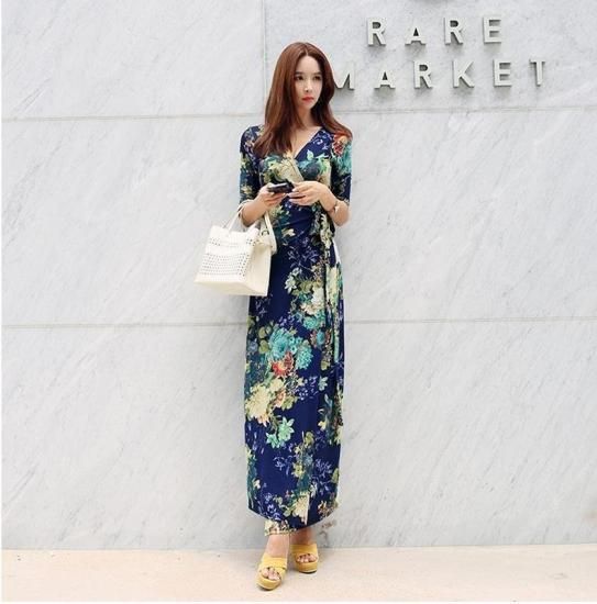 華やかなボタニカルプリント タイトカシュクールがセクシーなマキシ丈袖ありラップワンピース 2色