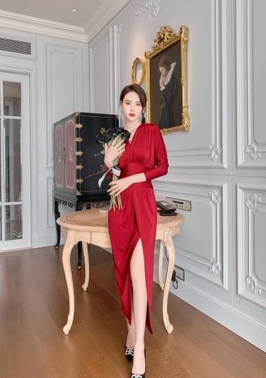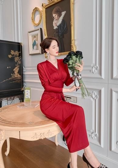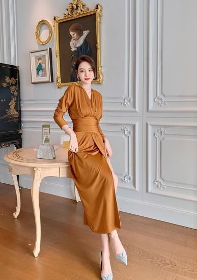 3color 美シルエットなロング丈長袖スリットドレス ワンピース キャバドレス