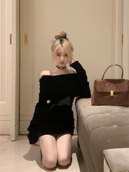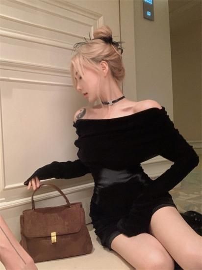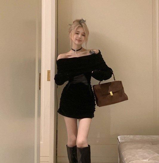 XS〜L オフショルダーのミニ丈長袖メリハリワンピース タイトドレス 黒