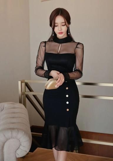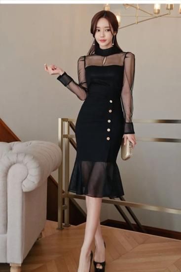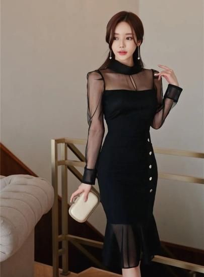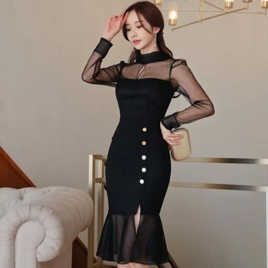 シアーミックスの膝丈長袖ブラックマーメードワンピース ラウンジドレス 黒