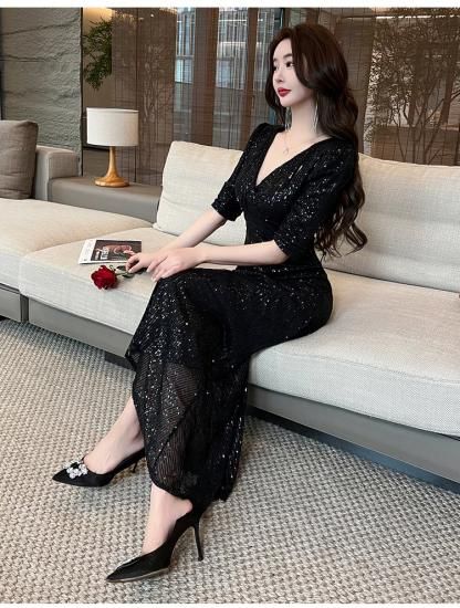 スパンコール×シアーワンピ ロング丈半袖Vネックのボディコンワンピース ドレス 3色