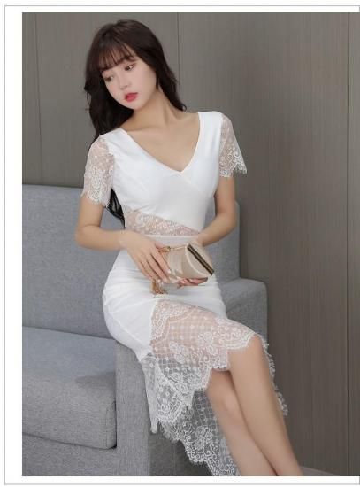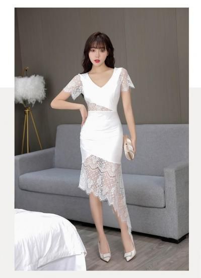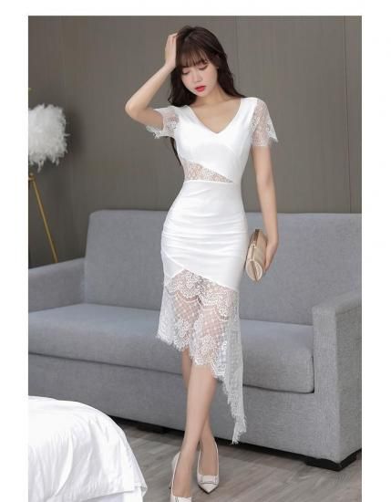 アシンメトリー レースミックスのマキシ丈タイトワンピース ドレス 2色 白 黒 S〜4L