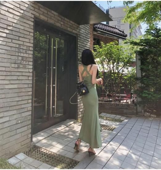 バッククロス×ギャザーがかわいいロング丈ノースリーブタイトワンピース ラウンジドレス