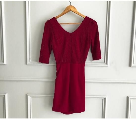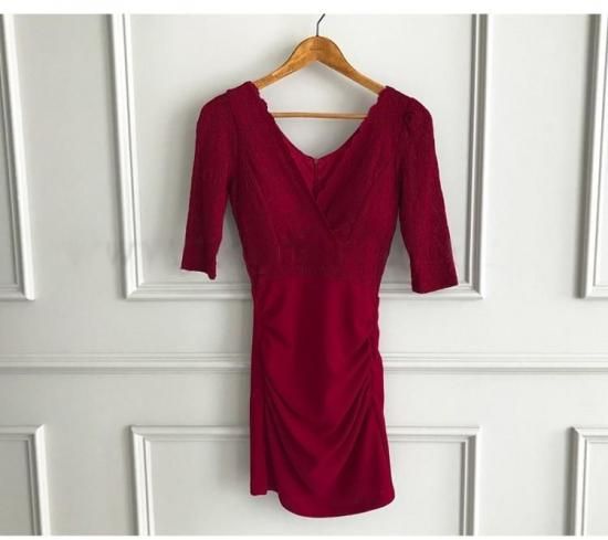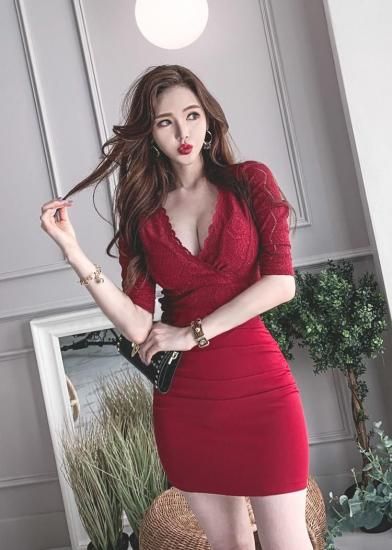 大胆な胸元カット レーストップの膝丈タイトドレス ラウンジドレス 赤