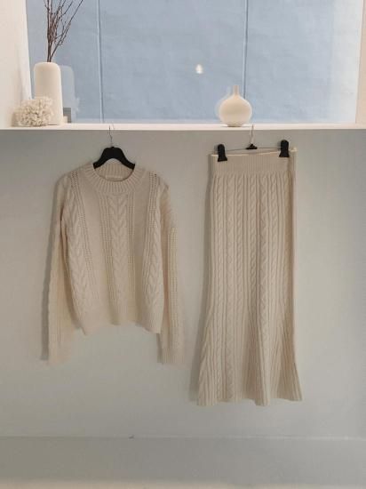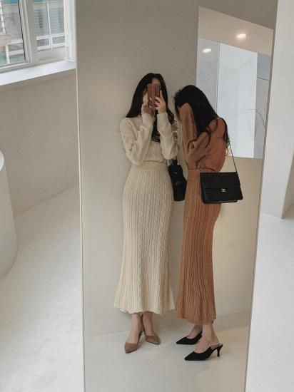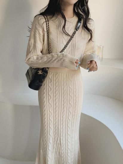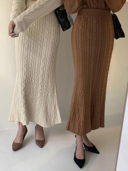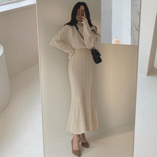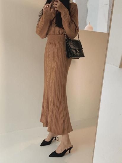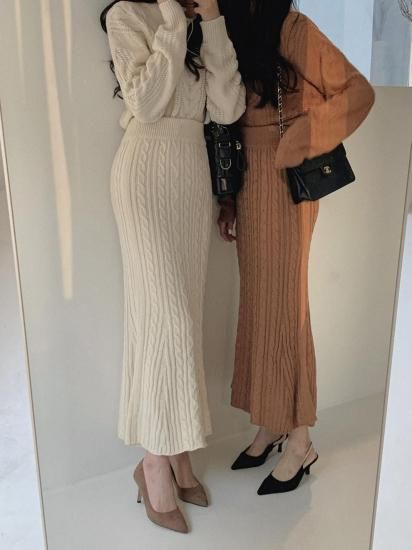 きれいめカジュアル ケーブルニットの長袖トップスとタイトスカートのセットアップ 2色