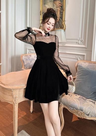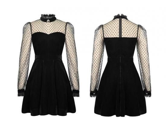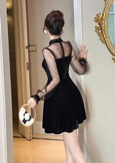 シアーミックスが色っぽいプチドットのミニ丈長袖ブラックタイトドレス ワンピース