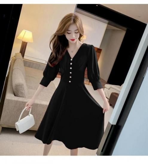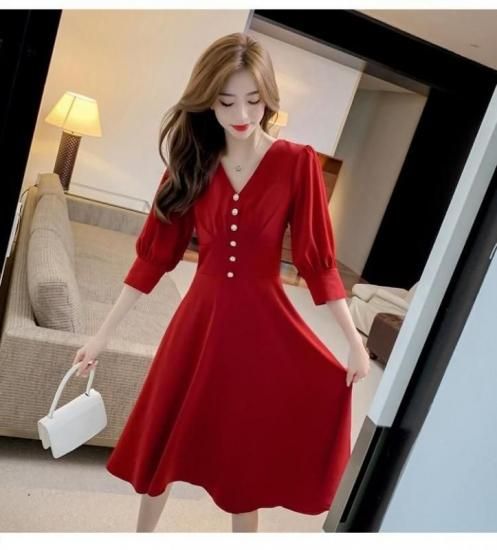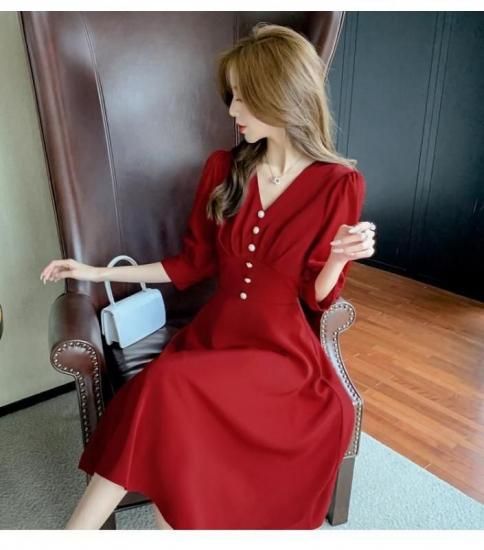 ボタンのアクセントがおしゃれ 膝丈袖ありフレアワンピース 2色
