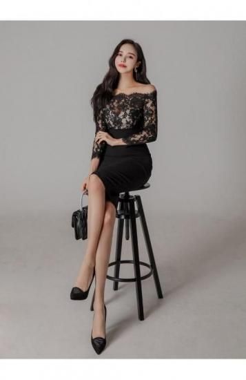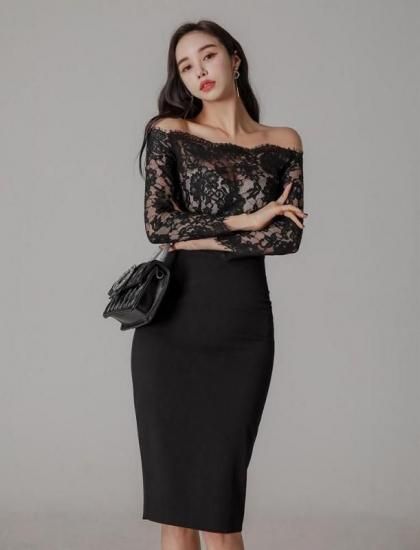 レディな大人スタイル レーストップのオフショルタイトドレス ワンピース 黒 白