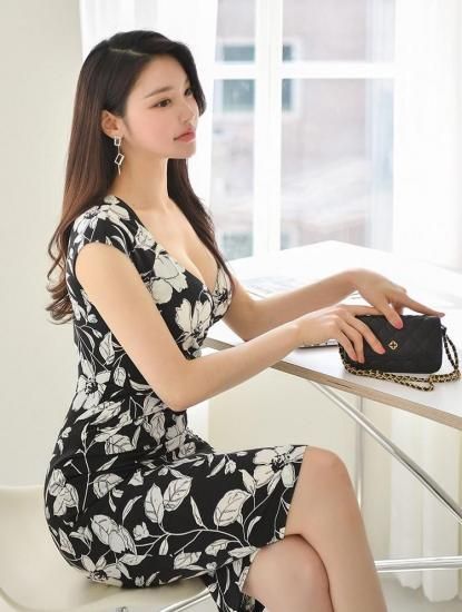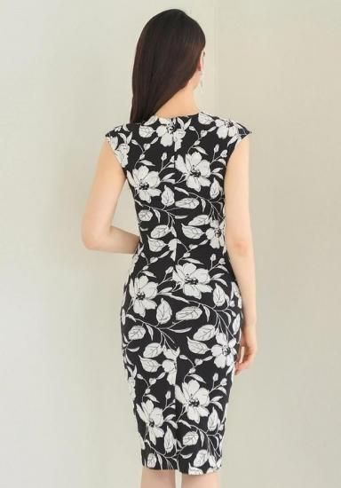 モノトーンフラワープリント ミディ丈ノースリーブのブラックタイトワンピース