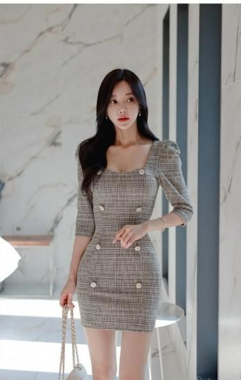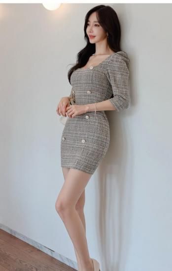 上品ツイードのミニ丈袖ありタイトワンピース ラウンジ デート 同伴