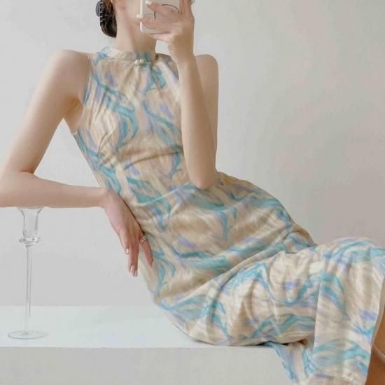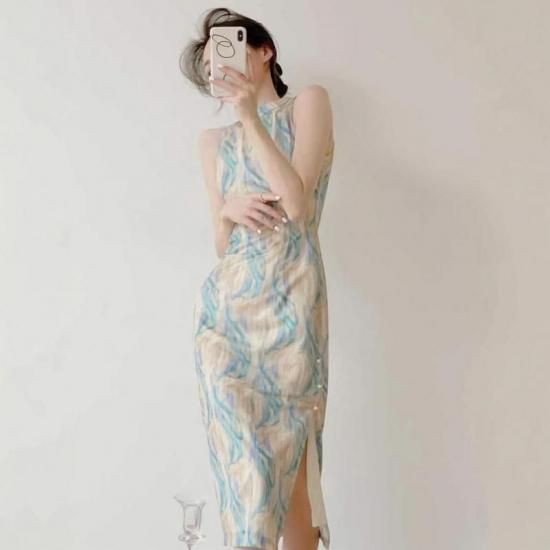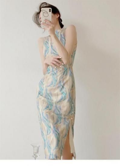 おしゃれなマーブルプリント パール付きノースリーブタイトドレス ワンピース