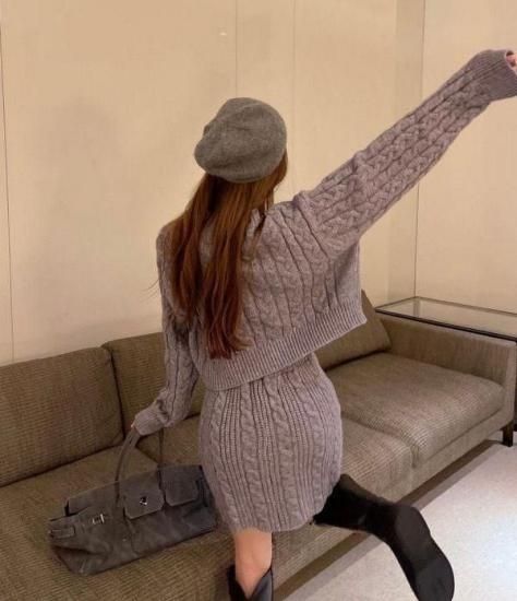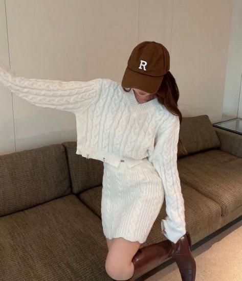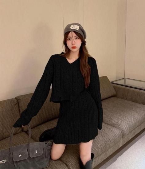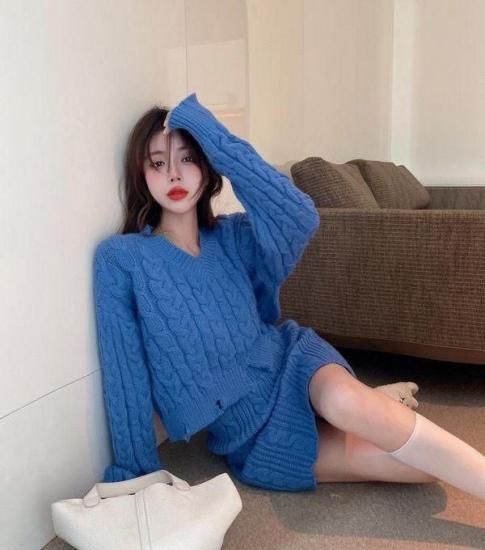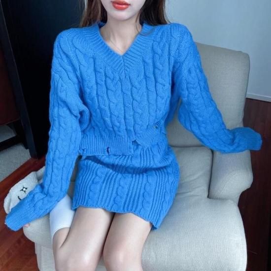 ケーブルニットがかわいいVネックのスカートセットアップ 4色