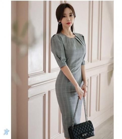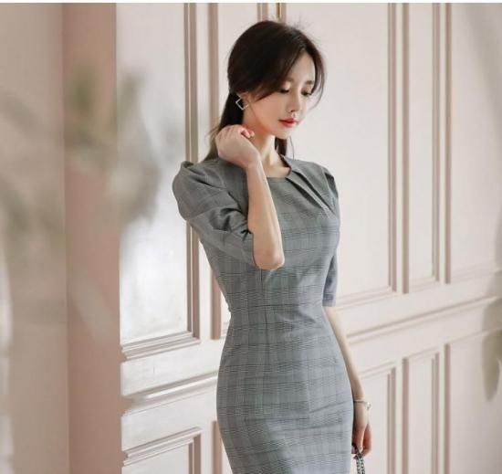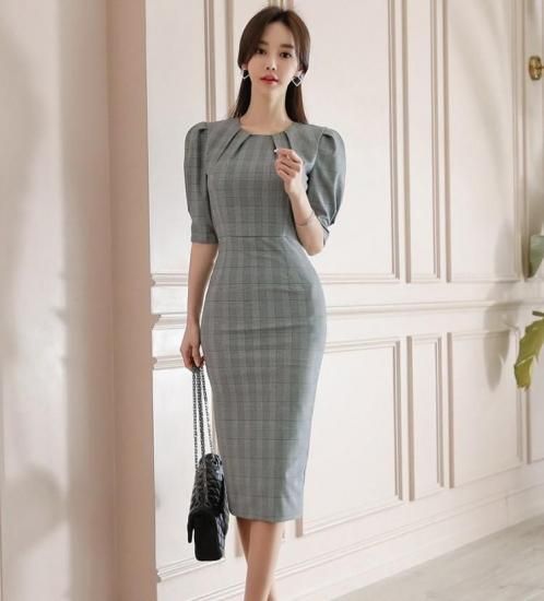 清楚かわいいチェック柄 膝丈五分袖タイトワンピース ラウンジ