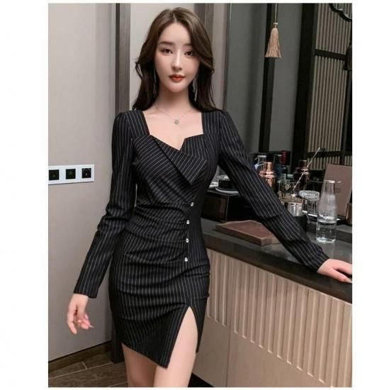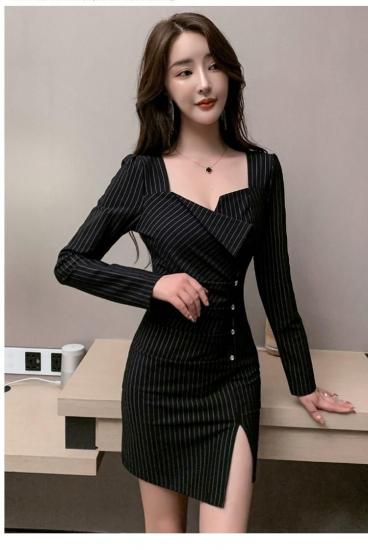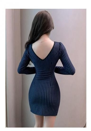 人気のストライプ柄 サイドボタンのミニ丈長袖ボディコンワンピース キャバスーツ 2色