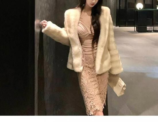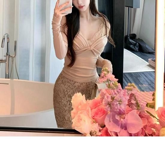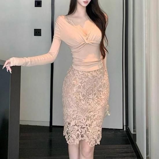 2点SET 透かしフラワーレースがかわいい長袖セットアップ ボディコン