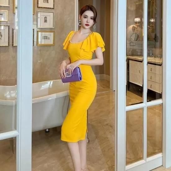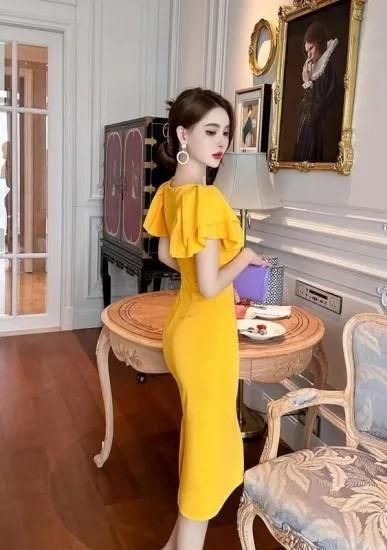 【即納】イブニングドレスにも ドレープスリーブのミモレ丈タイトドレス  イエローL