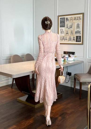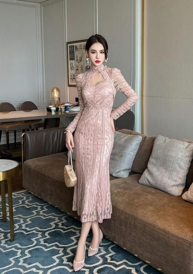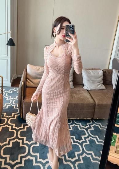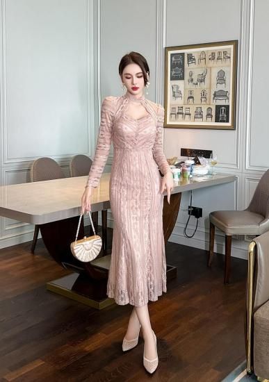 オトナかわいいボタニカルレース ロング丈長袖タイトドレス ワンピース